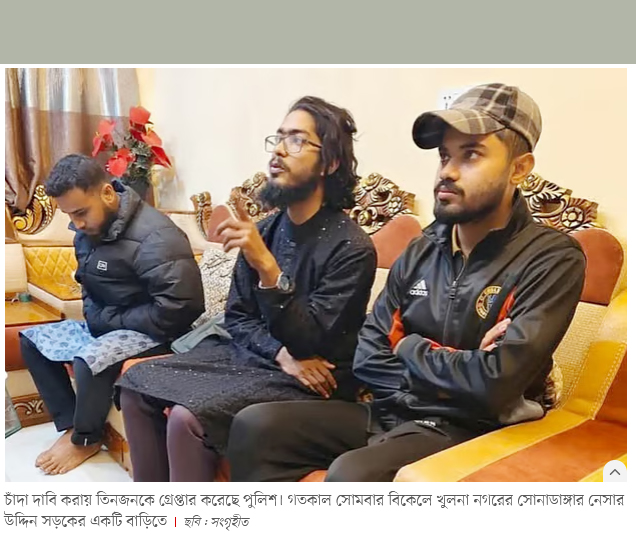 খুলনার কয়রা উপজেলা পরিষদের সাবেক চেয়ারম্যান ও উপজেলা যুবলীগের সভাপতি শফিকুল ইসলামের বাড়িতে গিয়ে এনসিপির প্রতিনিধি পরিচয় দিয়ে ২০ লাখ টাকা চাঁদা দাবি করা হয়েছে। এ ঘটনায় পুলিশ তিনজনকে গ্রেপ্তার করেছে।